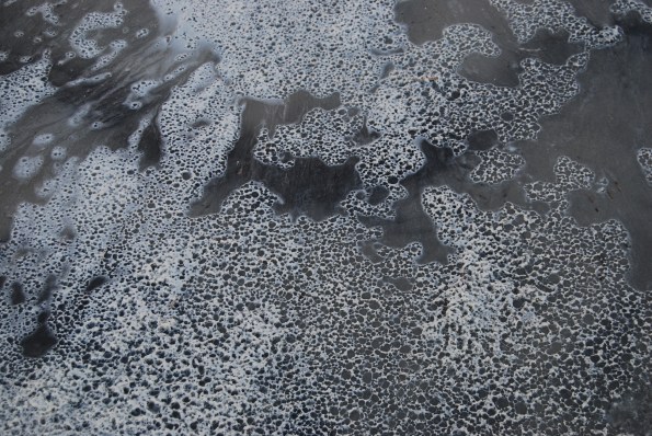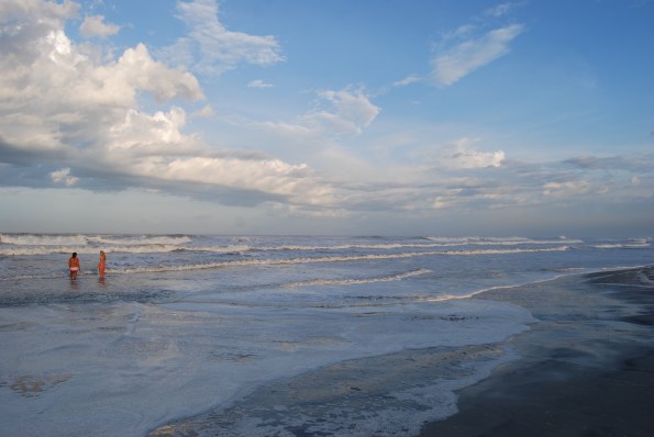 The waves were rushing in creating frothy foam along the beach.