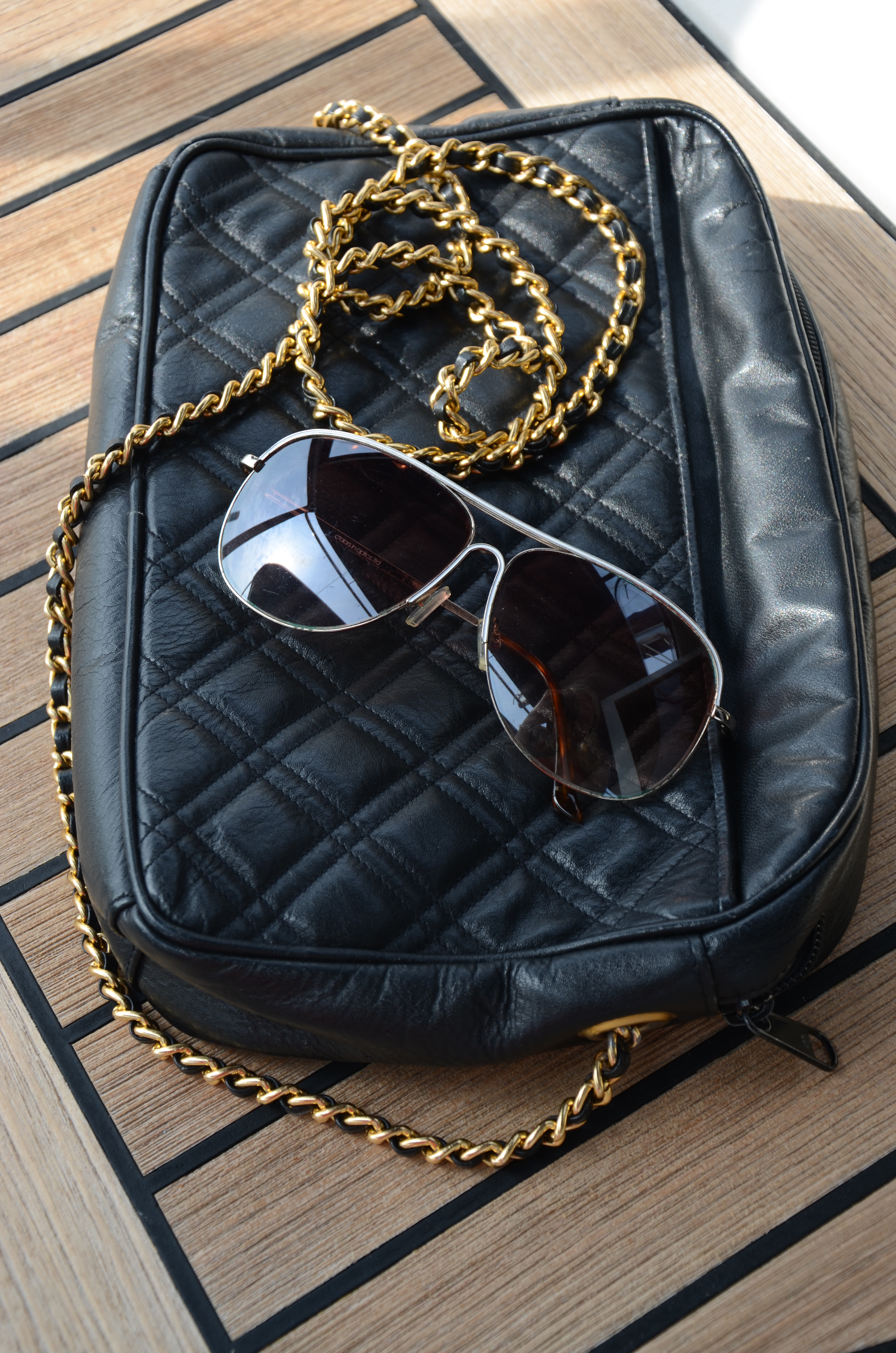 7. Black, quilted leather purse from my mom and gold frame aviators from Marshalls